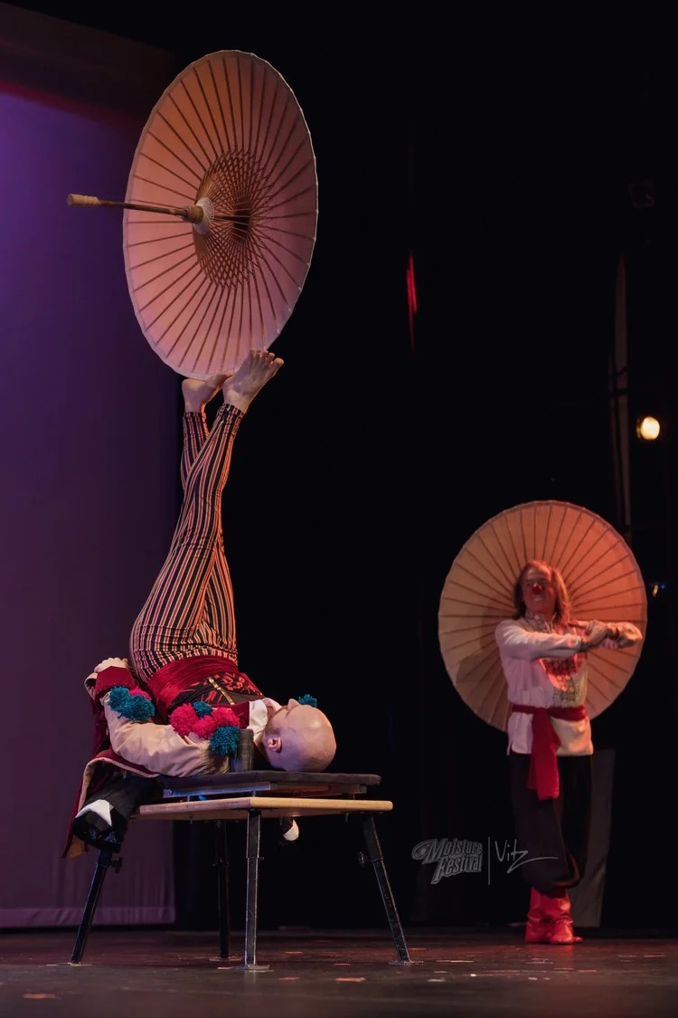 The Belugin Bros. hail from Vareniki, a small European country located somewhere between here and there. Growing up on their grandmother’s vineyard, they heard their calling at a young age after seeing an acrobatic troupe perform in their village. Avi fell in love with foot juggling and Alexander with clowning. Soon, they expanded their skill-sets into a show which they performed all over town, whether the villagers liked it or not.